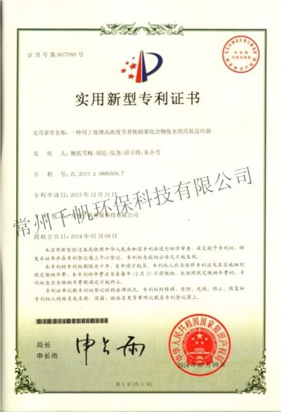 實用新型專利證書 一種用于處理高濃度芳香族硝基化合物廢水的厭氧反應(yīng)器