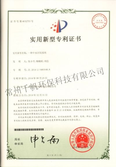 實用新型專利證書 一種中水回用系統(tǒng)