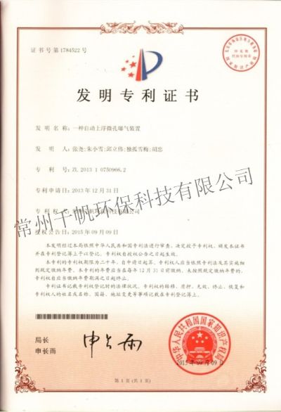 發(fā)明專利證書 一種自動上浮微孔曝氣裝置